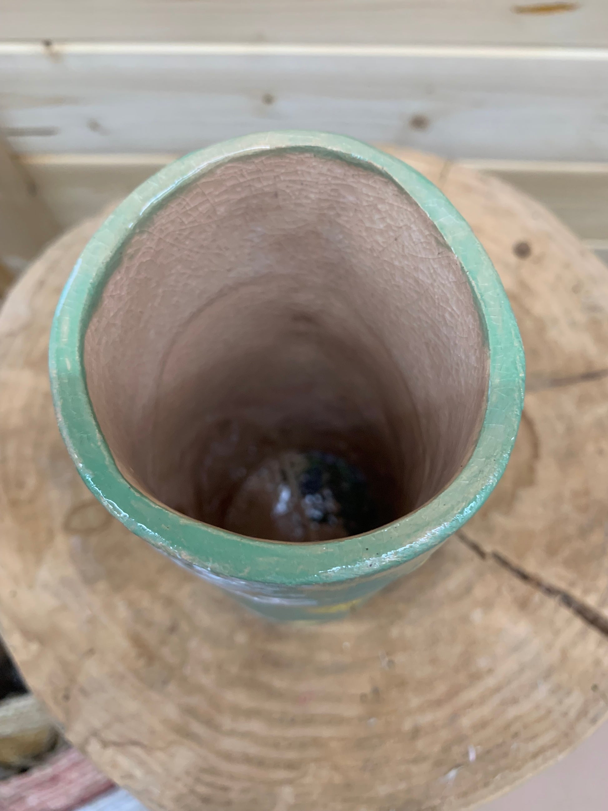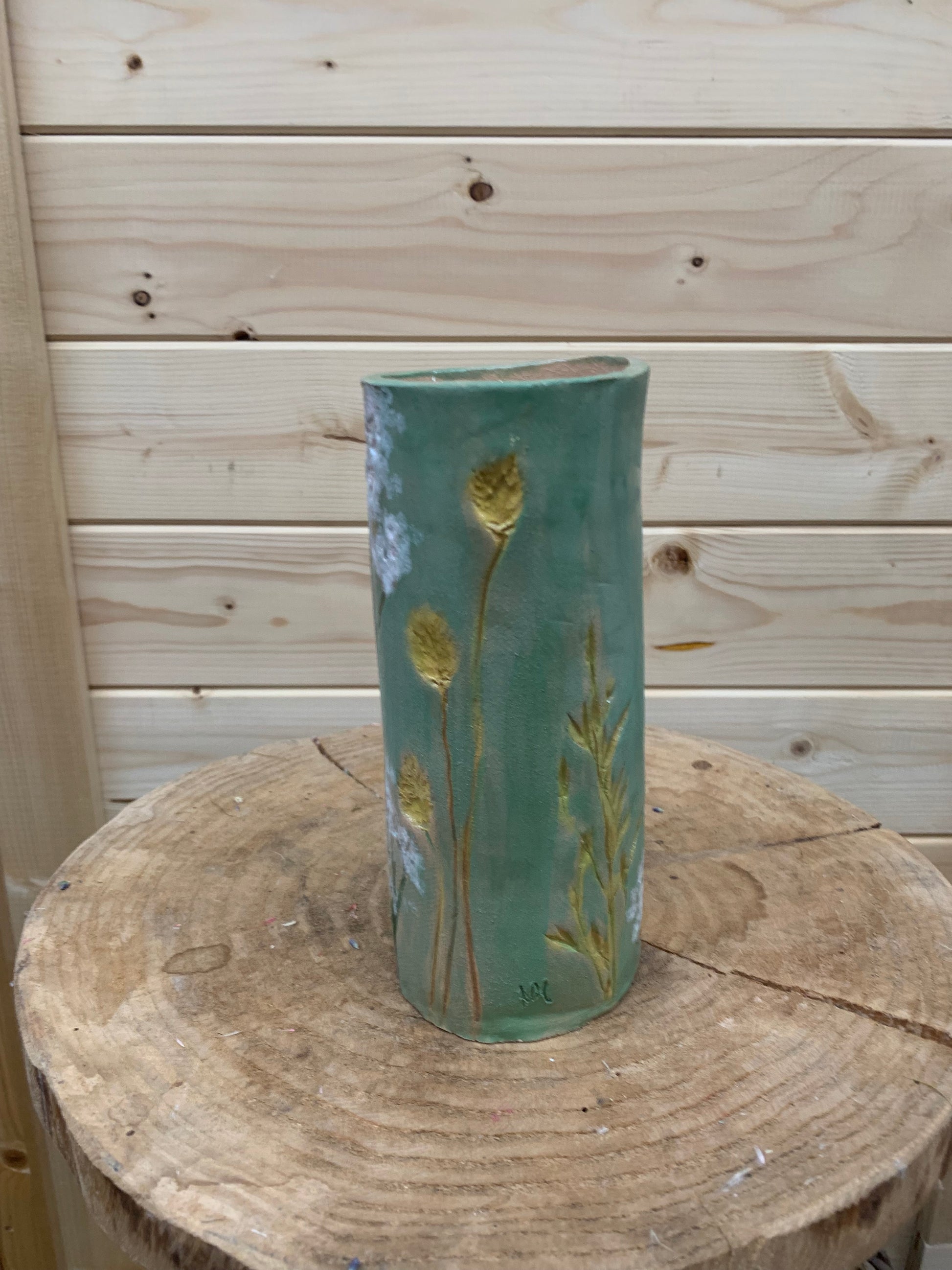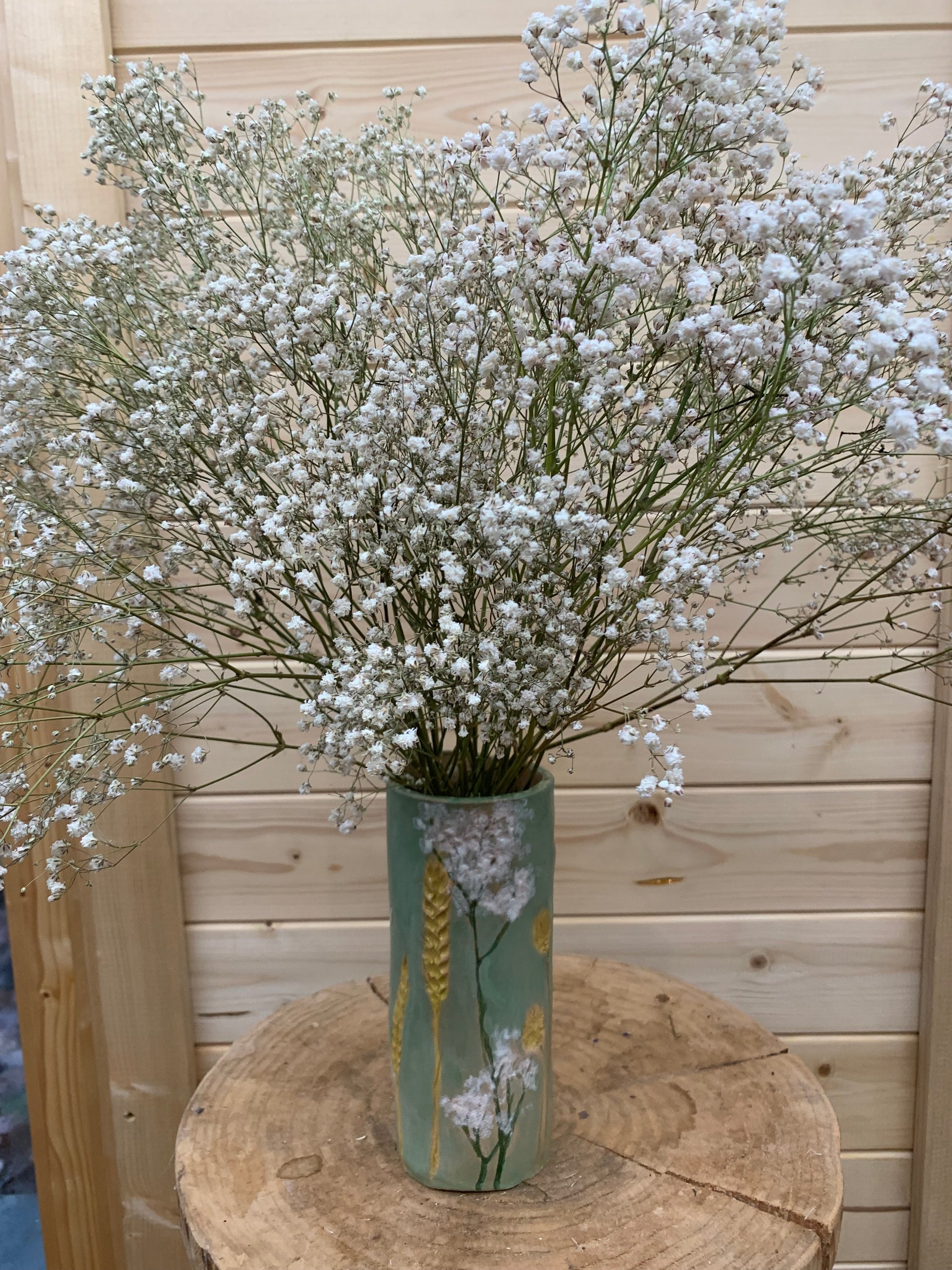 This vase was inspired by the dried flowers I like to use in dried bouquets, wheat, oats, lavender and dried gypsophila. Painted with a fresh green back ground and a clear glaze. This is a one off original design.